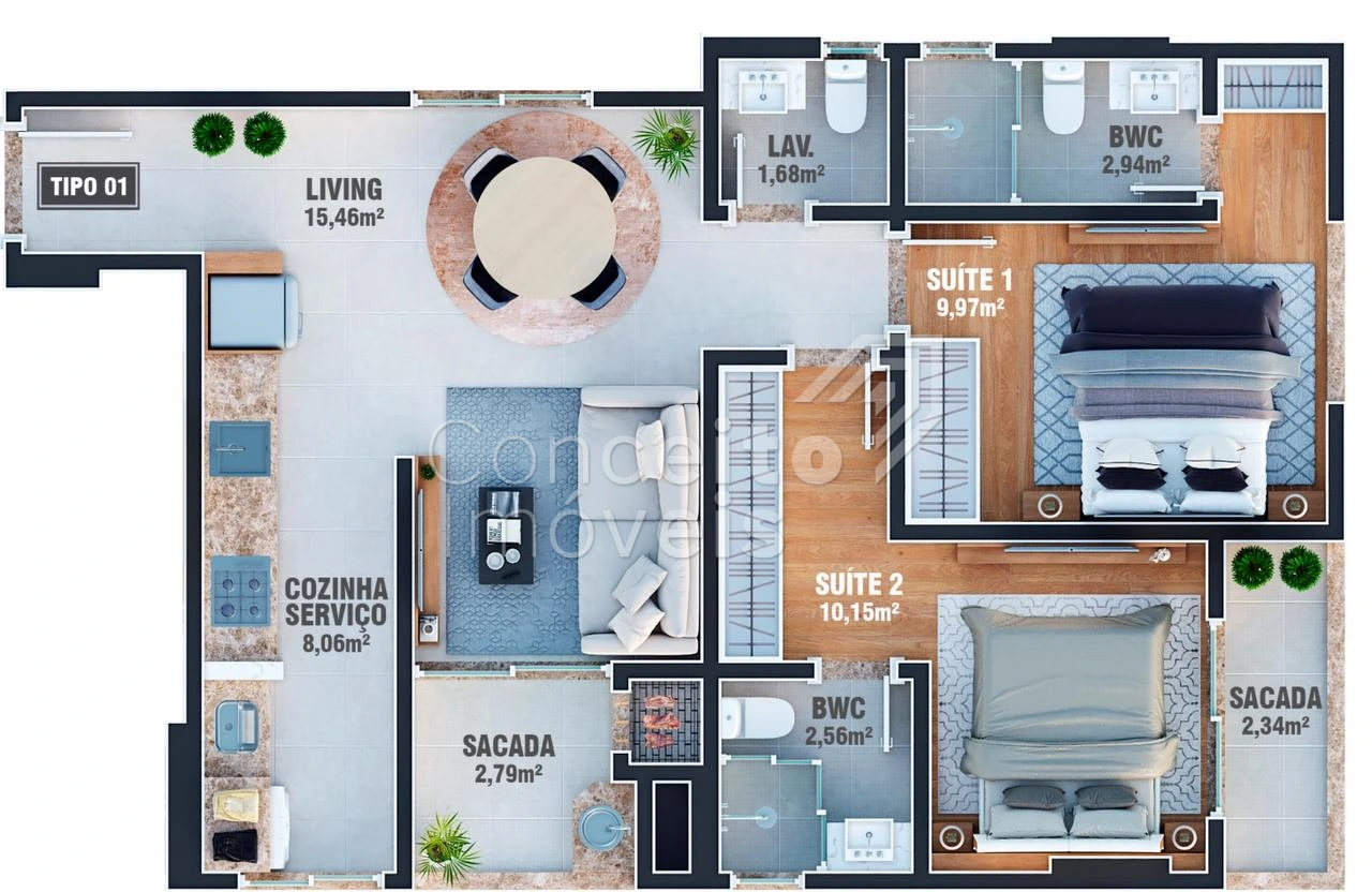 • Área Privativa68,70m²