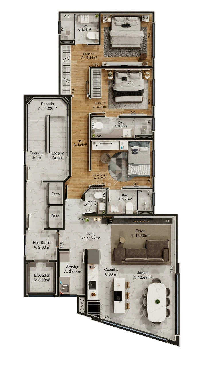 Piso vinílico nos dormitórios para maior acústica e conforto.
