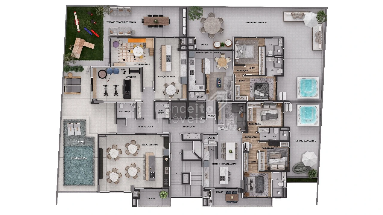 Áreas de lazer amplas e bem equipadas, incluindo piscina, salão de festas, e espaço gourmet.
