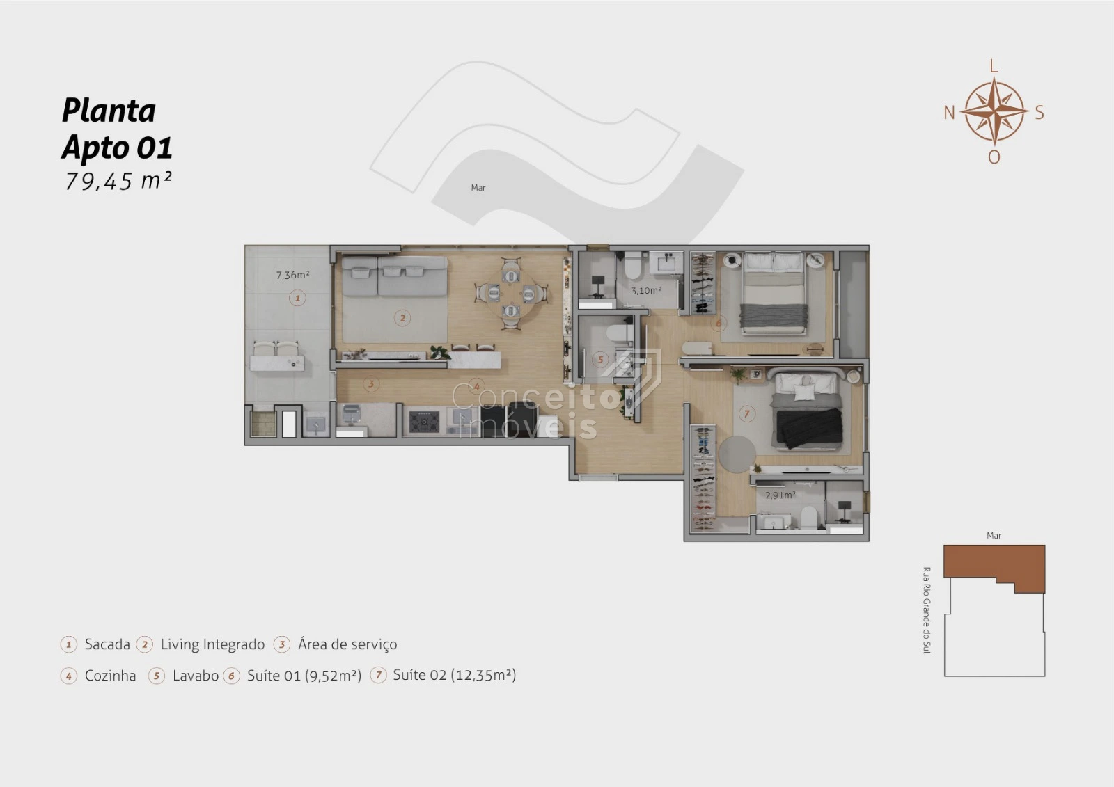Com 77,98 m² de área privativa, a unidade Tipo 03 – 1003 apresenta uma planta extremamente bem resolvida, proporcionando fluidez entre os ambientes e uma experiência de morar elevada a outro nível.
