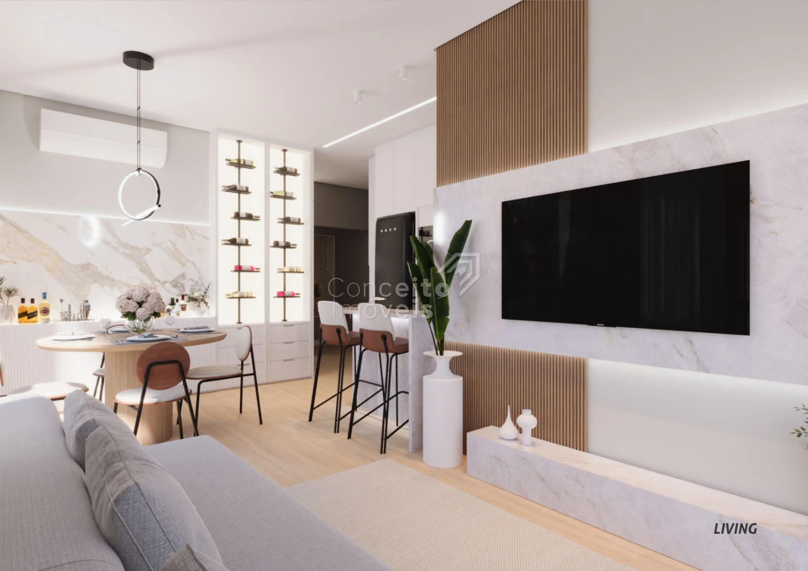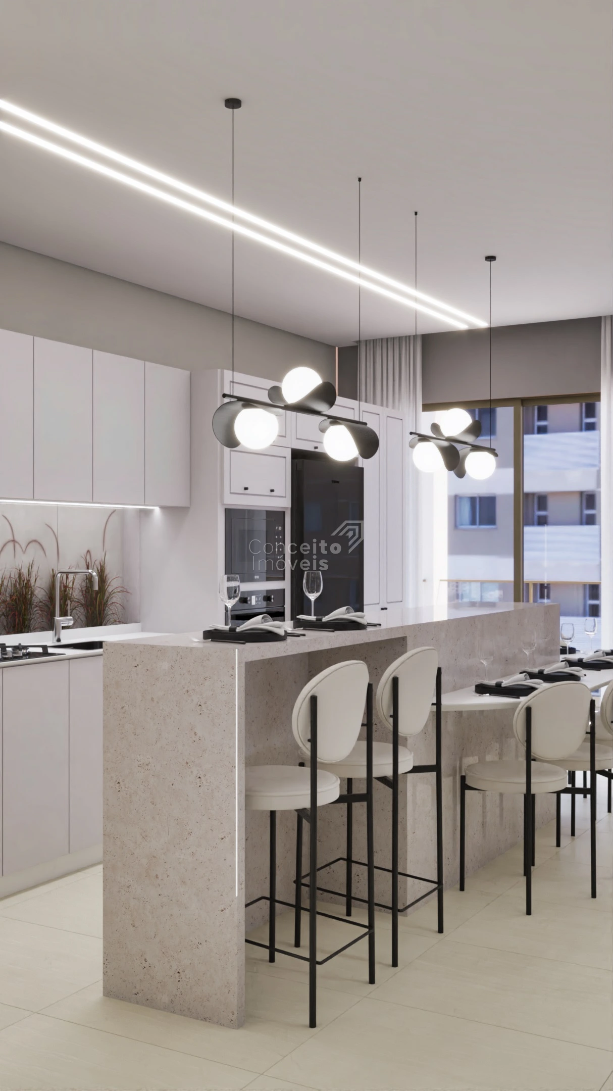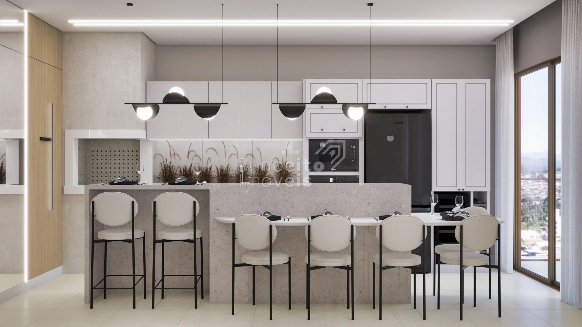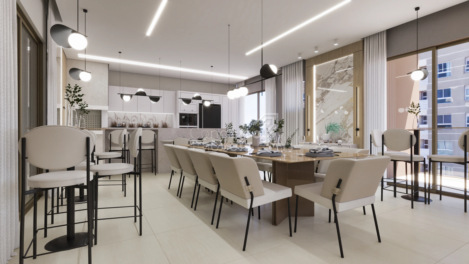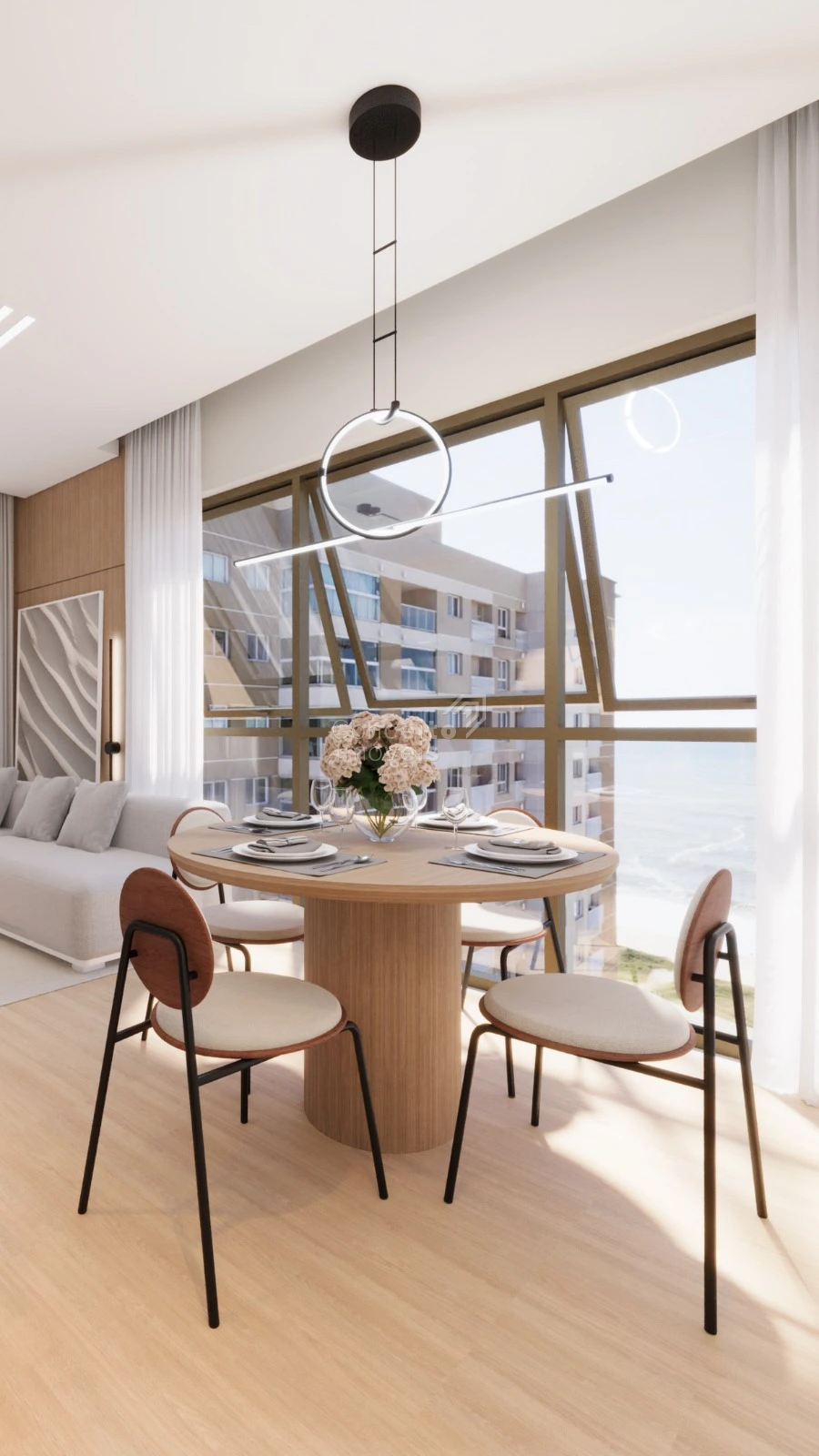 A área social se destaca pela integração harmoniosa, favorecendo a convivência, a luminosidade natural e a sensação de amplitude. Um espaço pensado para receber, viver e desfrutar de momentos únicos, com conforto absoluto e elegância atemporal.